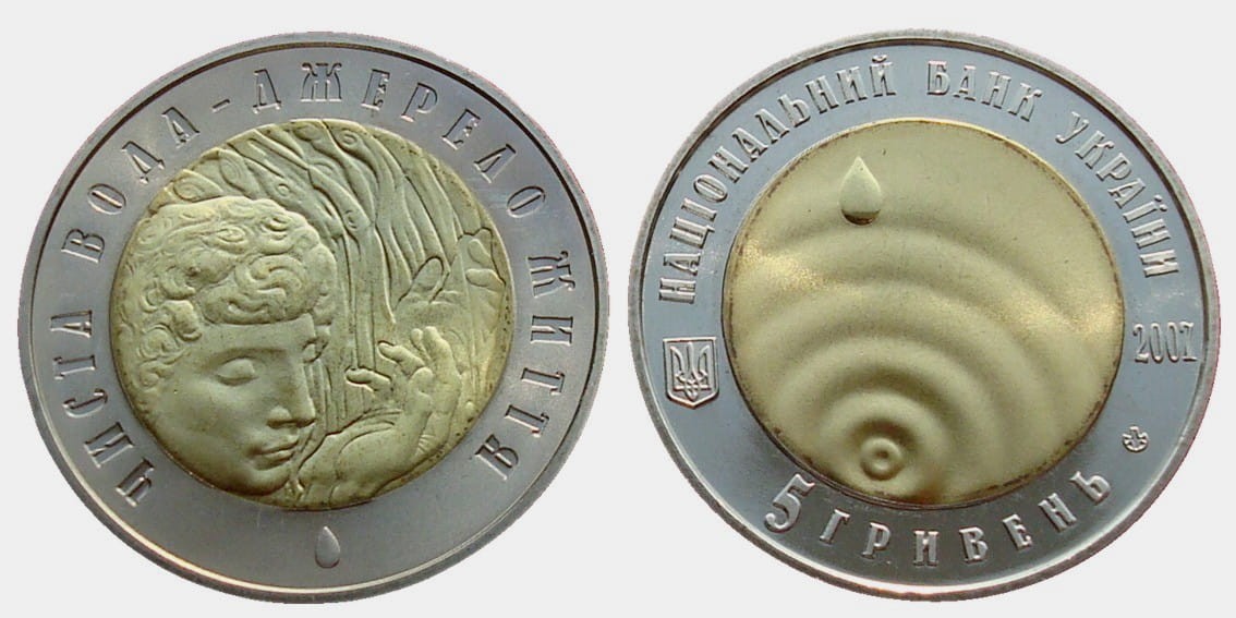Awers: Kompozycja składająca się z kręgów, jakie powstają na powierzchni wody pod wpływem uderzenia kropli. Na górze wizerunek kropli. W zewnętrznym kręgu po lewej mały państwowy herb Ukrainy, po prawej rok wydania 2007 i znak mennicy NBU, a wzdłuż rantu napisy: НАЦІОНАЛЬНИЙ БАНК