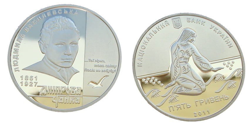 Opis: moneta poświęcona 150-tej rocznicy urodzin ukraińskiej pisarki - Czajki Dnieprowej (Ludmiły O. Wasilewskiej), autorki wielu wierszy, opowiadań oraz librett oper dziecięcych (m.in. do muzyki Łysenki).