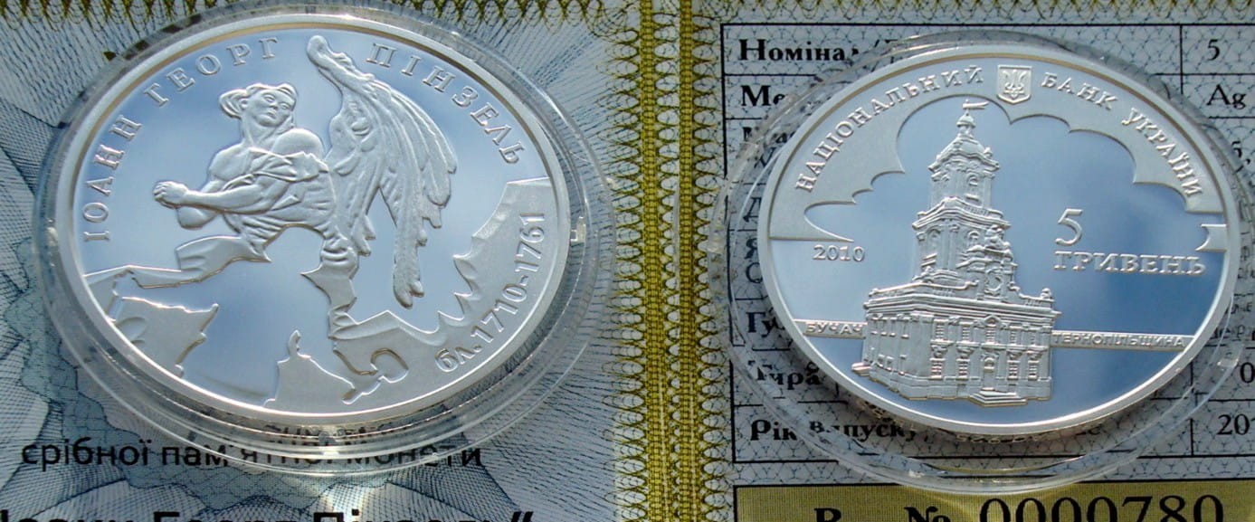 Opis: Moneta poświęcona wybitnemu rzeźbiarzowi połowy XVIII wieku, przedstawicielowi późnego baroku i rokoko. Jan Jerzy Pinzel tworzył w kamieniu i drewnie, założył Lwowską Szkołę Rzeźbiarstwa. Zagadkowa postać, o której nie zostało wiele informacji i która została zapomniana na ponad 200 lat. W ostatnim czasie zwrócono uwagę na jego prace, nazywając słowiańskim Michałem Aniołem. W 2011 w Luwrze będą prezentowane jego prace. W dorobku Pinzela znajdują się między innymi: zdobienia ratusza w Buczaczu, wielkie zespoły ołtarzowe wyrzeźbione w drewnie w Horodence, Horowicy, Buczaczu, dekoracje w kościele św. Jury we Lwowie, kaplicy w Mariampolu.