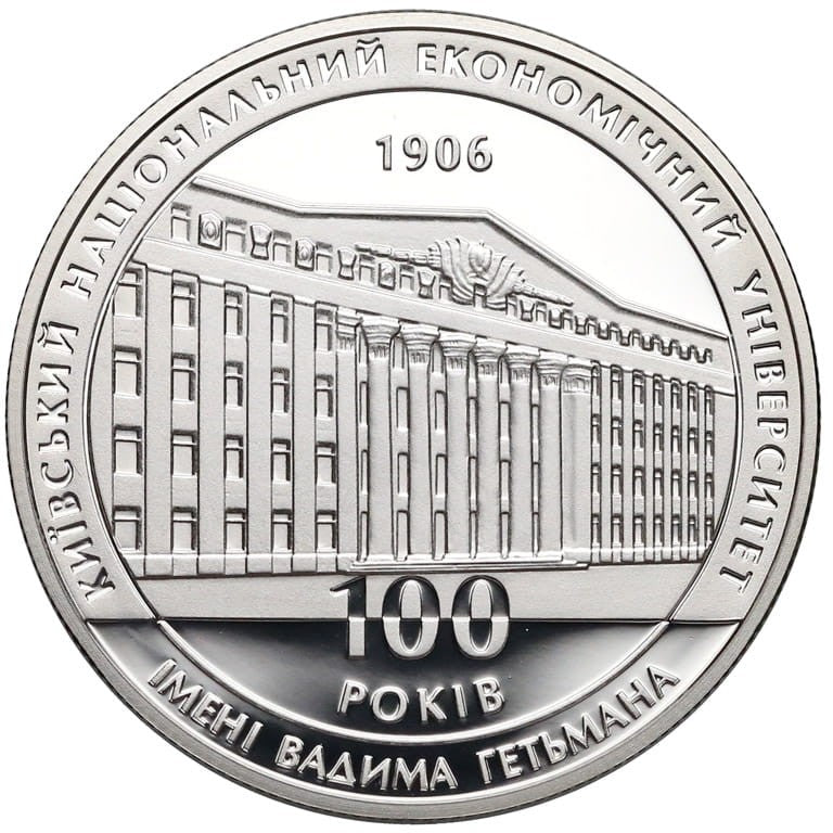 Na awersie znajduje się kompozycja z linii, które symbolicznie odzwierciedlają dynamikę współczesnych globalnych procesów gospodarczych. Kompozycja zawiera również międzynarodowe znaki matematyczne i znak hrywny. Na rewersie zobrazowano budynek uniwersytetu, a nad nim rok jego założenia - 1906.
