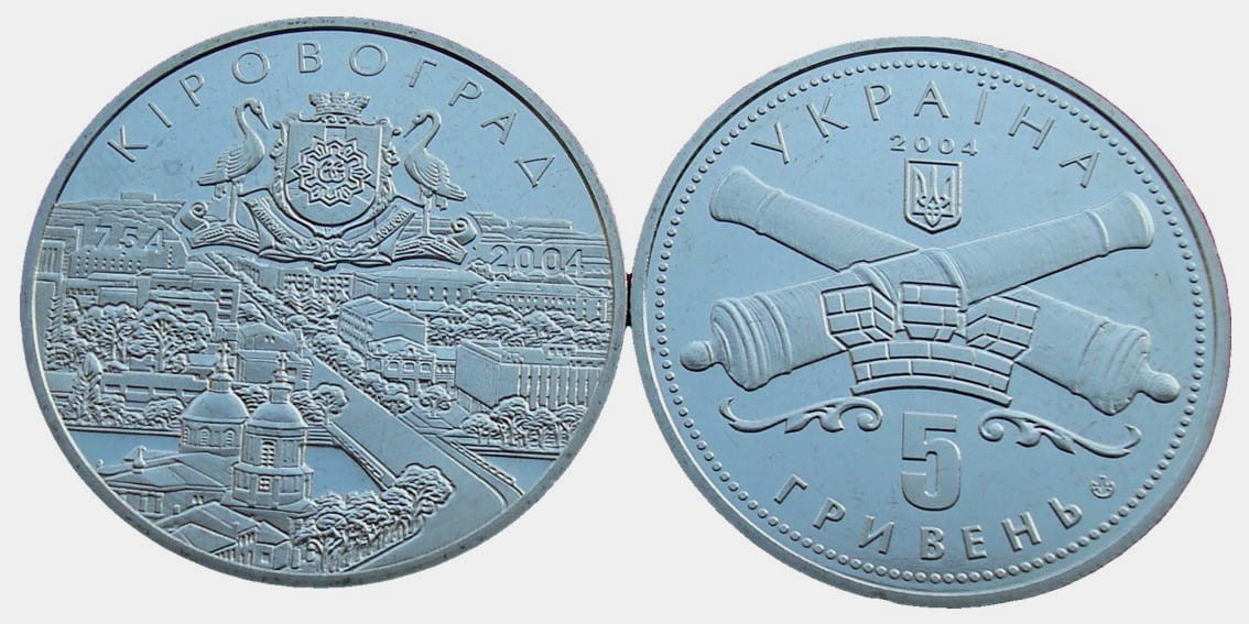 Awers: Dwie krzyżujące się armaty, nad nimi mały państwowy herb Ukrainy, data wydania 2004 oraz w półkolu napis УКРАЇНА, na dole nominał 5/ ГРИВЕНЬ oraz znak mennicy NBU.