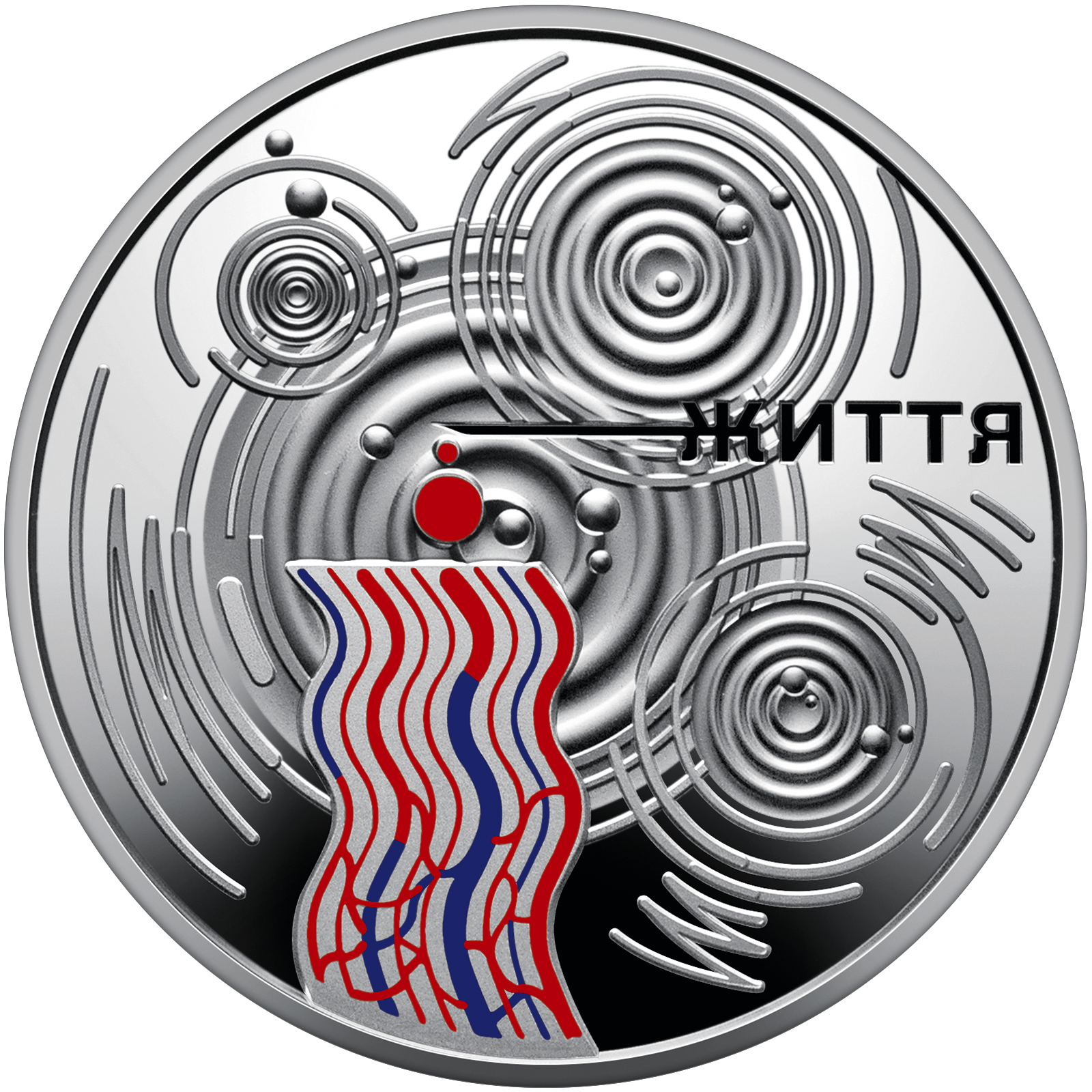 Rewers: na gładkim tle, po prawej stronie, znajduje się napis ЖИТТЯ (życie), który jest stylizowany jako system transfuzji krwi z igłą. Ten element symbolizuje proces dostarczania krwi do naczyń pokazanych w dolnym lewym rogu. Naczynia, które są już wypełnione krwią, są oznaczone na czerwono, a te, które jeszcze potrzebują krwi, są oznaczone na niebiesko. Stylizowana kropla i napis життя (życie) harmonijnie łączą się, tworząc nazwę monety – „Kropla Życia”. Tekstura matowego tła, na którym umieszczone są wszystkie te elementy, symbolizuje wielką potrzebę oddawania krwi w czasach wojny.