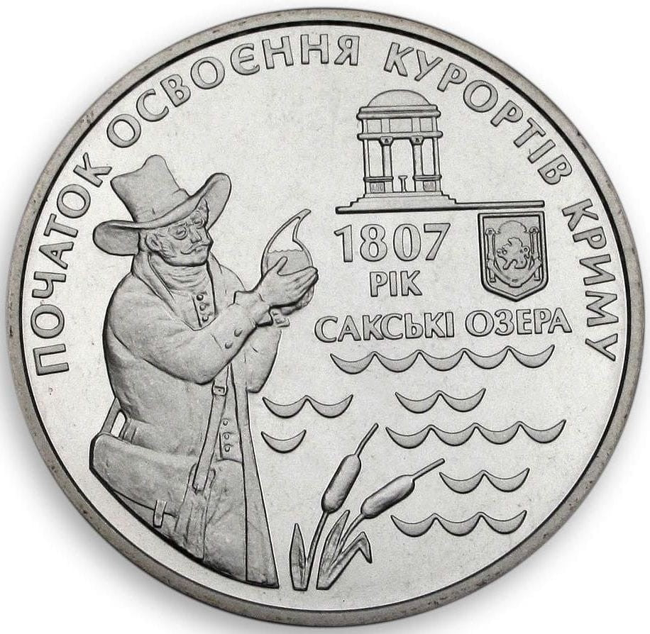 Opis: Moneta poświęcona 200-leciu krymskiej balneologii, która zainicjowała odkrycie kurortowych bogactw Krymu. Półwysep przykuł uwagę nie tylko lekarzy, ale i władzy. Podstawowym zasobem leczniczym, który wykorzystuje się w kuracjach jest sackie błoto (Jezioro Sackie, miasto Saki). Jego lecznice właściwości były badane już na początku XIX w.
