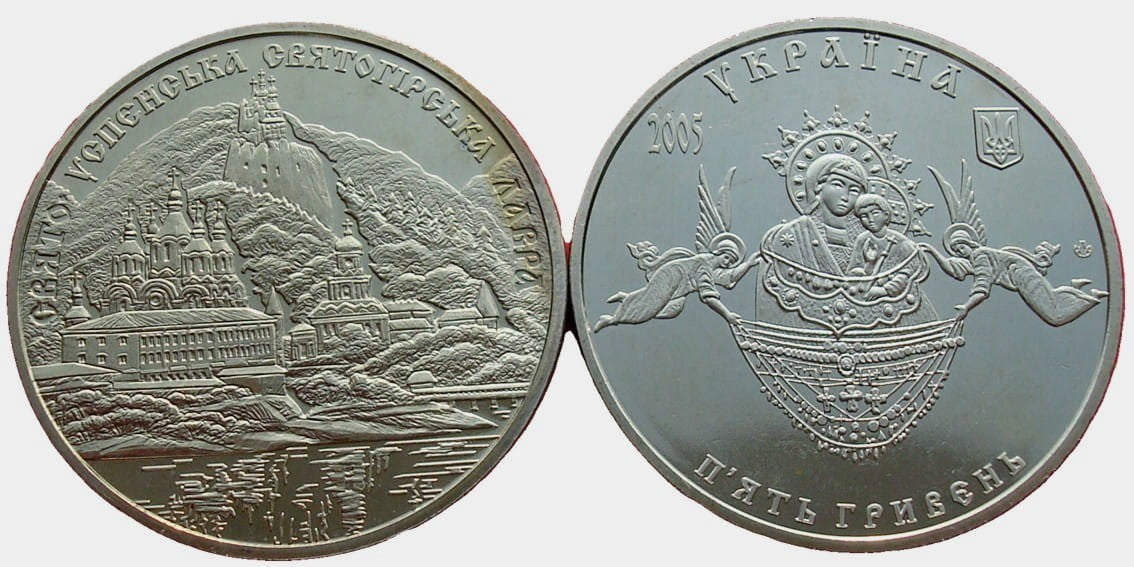 Awers: Po środku cudotwócza ikona Matki Boskiej Świętogórskiej, Nad nią w półkolu napis УКРАЇНА. Niżej po lewej rok wydania 2005, a po prawej mały państwowy herb Ukrainy. Na dole w półkolu nominał П’ЯТЬ ГРИВЕНЬ. Znak mennicy NBU.