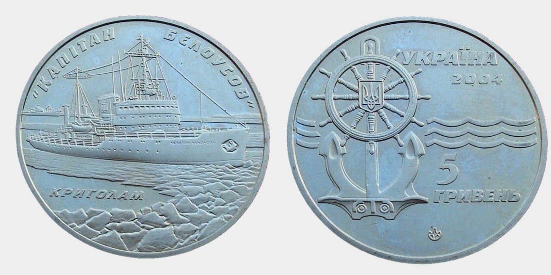 Opis: Moneta poświęcona lodołamaczowi, który już od ponad 50 lat toruje szlak innym łodziom i nosi imię doświadczonego kapitana polarnego, bohatera ZSRR - M.P. Biełousowa. Od 1994 lodołamacz wchodzi w skład państwowej handlowej Floty Mariupilskiej i wciąż wykonuje swoje obowiązki.