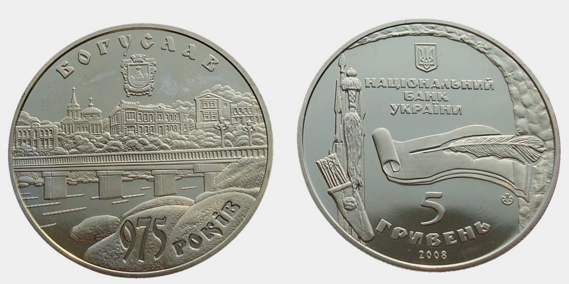 Awers: Na górze mały państwowy herb Ukrainy, pod nim napis НАЦІОНАЛЬНИЙ/ БАНК/ УКРАЇНИ. Po środku stylizowana kompozycja: kozacka zbroja, hetmański, buńczuk, rękopis i pióro, symbolizująca epokę kozacką i literackie życie miasta. pod spodem nominał 5/ ГРИВЕНЬ, rok wydania 2008 i znak mennicy NBU.
