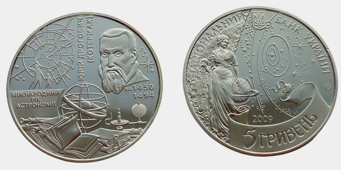 Awers: Na górze wzdłuż rantu napis НАЦІОНАЛЬНИЙ БАНК УКРАЇНИ rozdzielony małym państwowym herbem Ukrainy. Na dole rok wydania 2009 i znak mennicy NBU, a pod nim na stylizowanym zwitku nominał 5 ГРИВЕНЬ. Po środku kompozycja symbolizująca kosmos: po lewej stronie Urania - patronka astronomii (jedna z dziewięciu muz z mitologii greckiej), po prawej gwiezdna przestrzeń wraz z fragmentem schematu ruchu planet Układu Słonecznego.