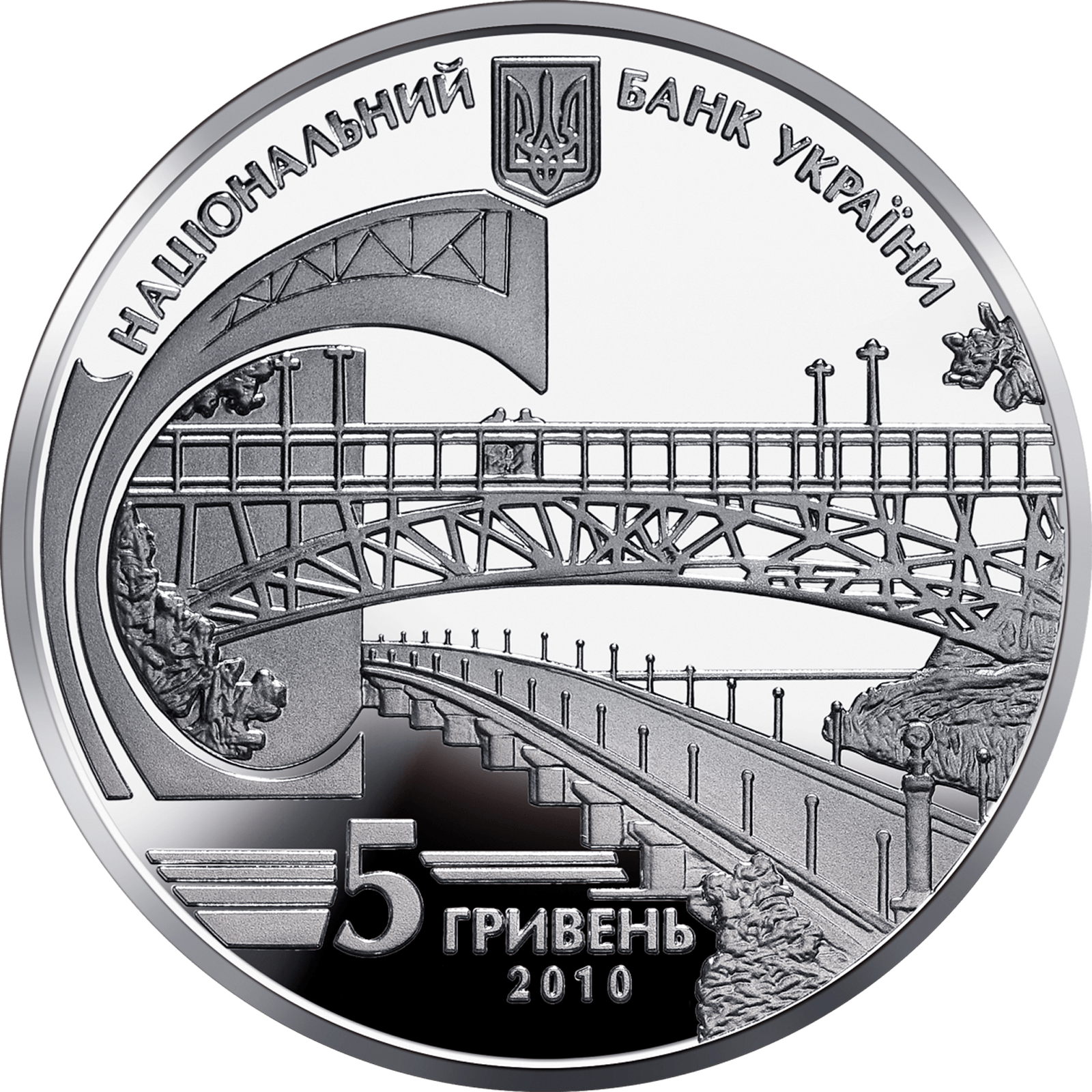 Awers: na górze wzdłuż rantu napis НАЦІОНАЛЬНИЙ БАНК УКРАЇНИ przedzielony małym państwowym herbem Ukrainy. Na dole nominał П’ЯТЬ ГРИВЕНЬ, a pod nim rok wydania 2010. Po środku kompozycja przedstawiająca jedną z działalności uczonego - budowę mostów. Jest to jeden z pierwszych mostów w Europie zbudowany metodą spawalniczą bez użycia nitów. Nad nim znajduje się kładka dla pieszych nad Aleją Piotrowską. Po lewej stylizowany kawałek pergaminu używanego do kreślenia planów.