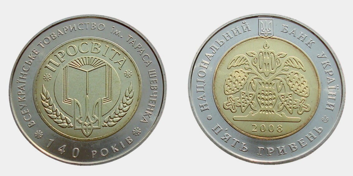 Opis: Moneta poświęcona Ogólnoukraińskiemu Towarzystwu Im. Tarasa Szewczenki "Proswita" i wydana z okazji 140. rocznicy powstania Towarzystwa. Ta kulturalno-oświatowa organizacja została założona przez grupę narodowców we Lwowie w 1868 r. w celu krzewienia oświaty wśród narodu ukraińskiego, utwierdzenia ukraińskiej myśli narodowej, rozwoju ukraińskiej kultury i kształtowania świadomości narodowej.
