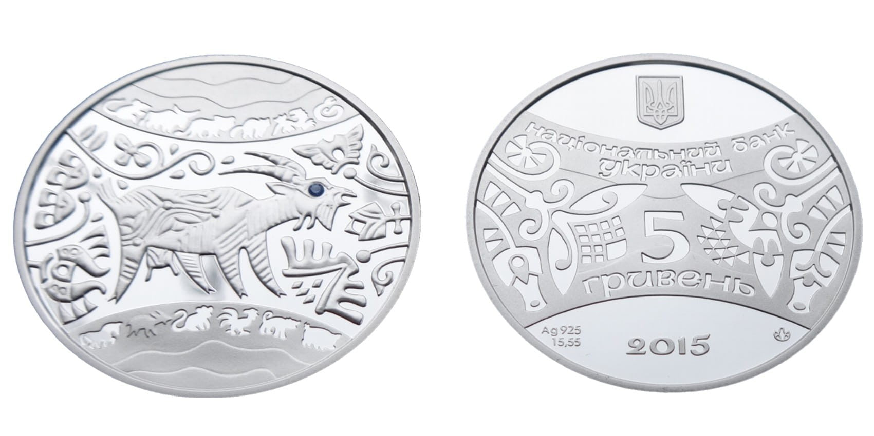 Awers: Na górze małe państwowe godło Ukrainy, na dole po lewej oznaczenie stopu i próby Ag.925 oraz masa 1,55 g, po środku rok wydania 2015, po prawej znak mennicy NBU. Po środku kompozycja w postaci stylizowanego roślinnego ornamentu, na którym umieszczono napis НАЦІОНАЛЬНИЙ БАНК/УКРАЇНИ oraz nominał 5 HRYWIEN.
