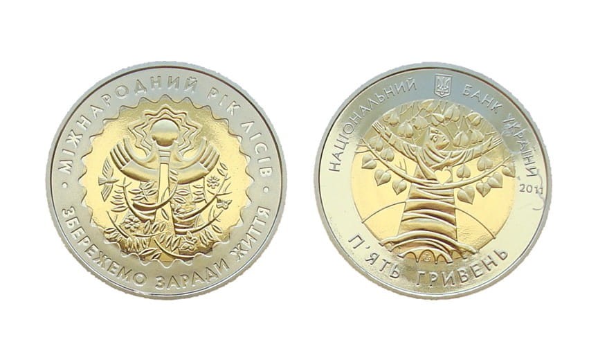 Awers: Na górze w srebrnej części dwukolorowej monety mały państwowy herb Ukrainy przedzielający napis НАЦІОНАЛЬНИЙ БАНК УКРАЇНИ, obok pod nim rok wydania 2011. Na dole wzdłuż rantu nominał П`ЯТЬ ГРИВЕНЬ. Po środku w złotej części monety wizerunek kwitnącego drzewa z gałęziami jak ramiona i sercem.