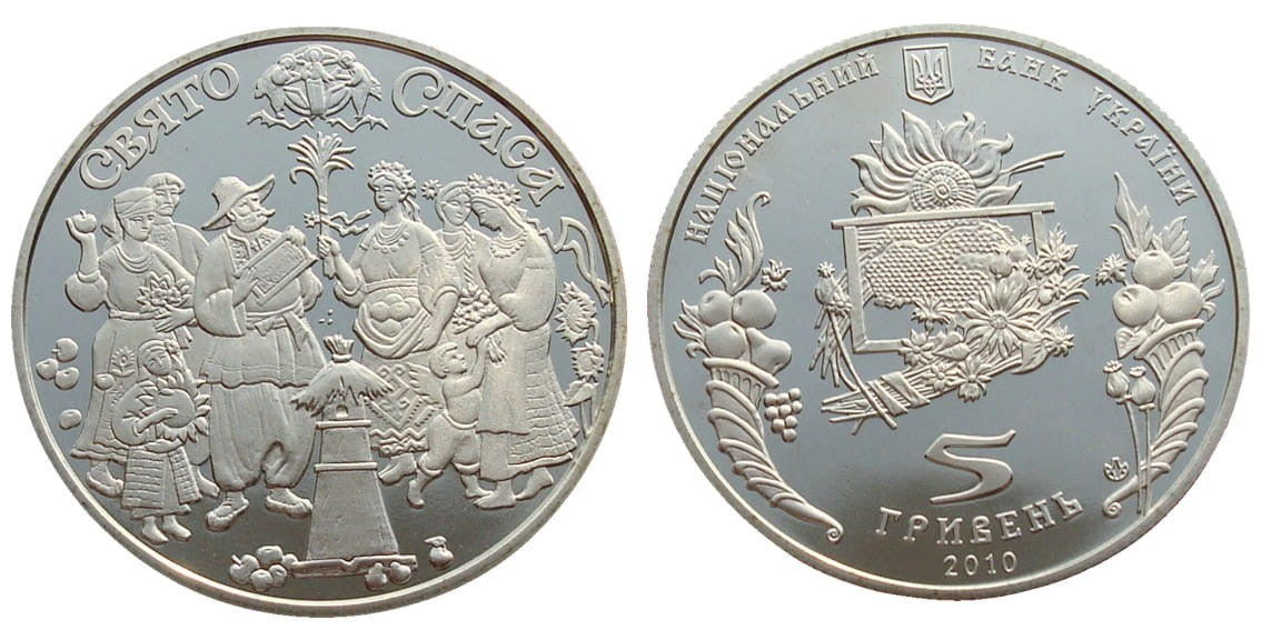 Awers: Wzdłuż rantu napis НАЦІОНАЛЬНИЙ БАНК УКРАЇНИ rozdzielony małym państwowym herbem Ukrainy. Na dole nominał 5 ГРИВЕНЬ i rok wydania 2010, po lewej stronie znak mennicy NBU. Po środku kompozycja symbolizująca Święto Przemienienia Pańskiego - plaster miodu obramowany bukietami kwiatów, na górze słonecznik. Po obu stronach rogi obfitości wypełnione jabłkami, gruszkami i winogronami.