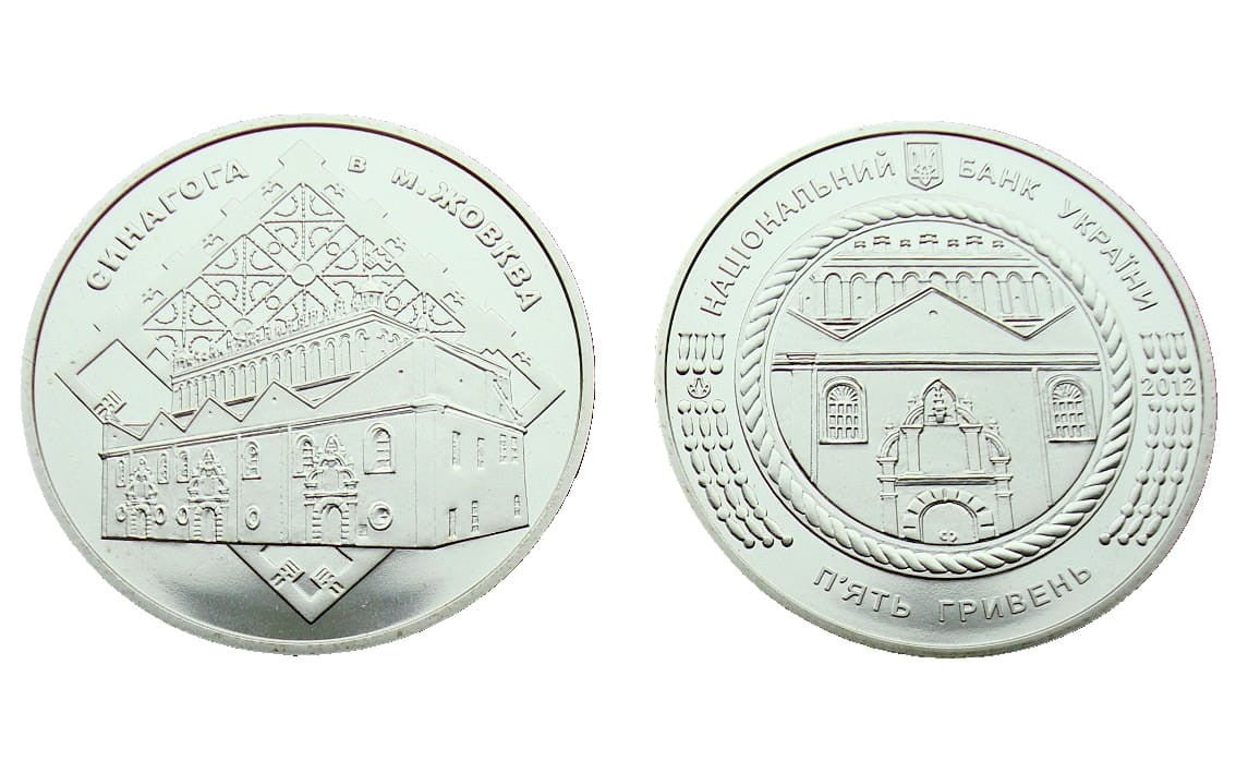 Awers: Wzdłuż rantu napisy: na górze НАЦІОНАЛЬНИЙ БАНК УКРАЇНИ rozdzielony godłem Ukrainy, na dole nominał П`ЯТЬГРИВЕНЬ, po prawej stronie pośród stylizowanego ornamentu rok wydania 2012, po lewej znak mennicy NBU. Po środku fragment fasady synagogi.