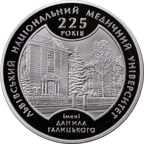 Opis: Moneta poświęcona 225 rocznicy założenia państwowego Uniwersytetu Medycznego we Lwowie. Jest to jedna z najstarszych uczelni medycznych na Ukrainie. W 1998 roku uniwersytetowi nadano imię Daniela Halickiego. Z placówką jest związanych wielu sławnych badaczy i naukowców.
