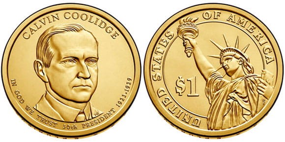Description: Features an image of Calvin Coolidge with the inscriptions CALVIN COOLIDGE, IN GOD WE TRUST, 30th PRESIDENT and 1923 – 1929.