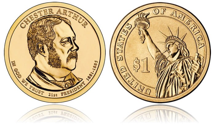 Description: Features an image of Chester Arthur with the inscriptions "CHESTER ARTHUR," "IN GOD WE TRUST," "21st PRESIDENT" and "1881-1885."