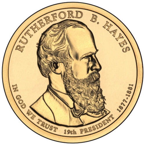 Description: Features an image of Rutherford B. Hayes with the inscriptions "Rutherford B. Hayes", "In God We Trust", "19th President" and "1877–1881."