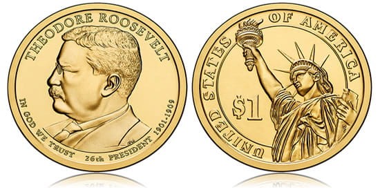 Description: Features an image of Theodore Roosevelt with the inscriptions THEODORE ROOSEVELT, IN GOD WE TRUST, 26th PRESIDENT and 1901 - 1909.