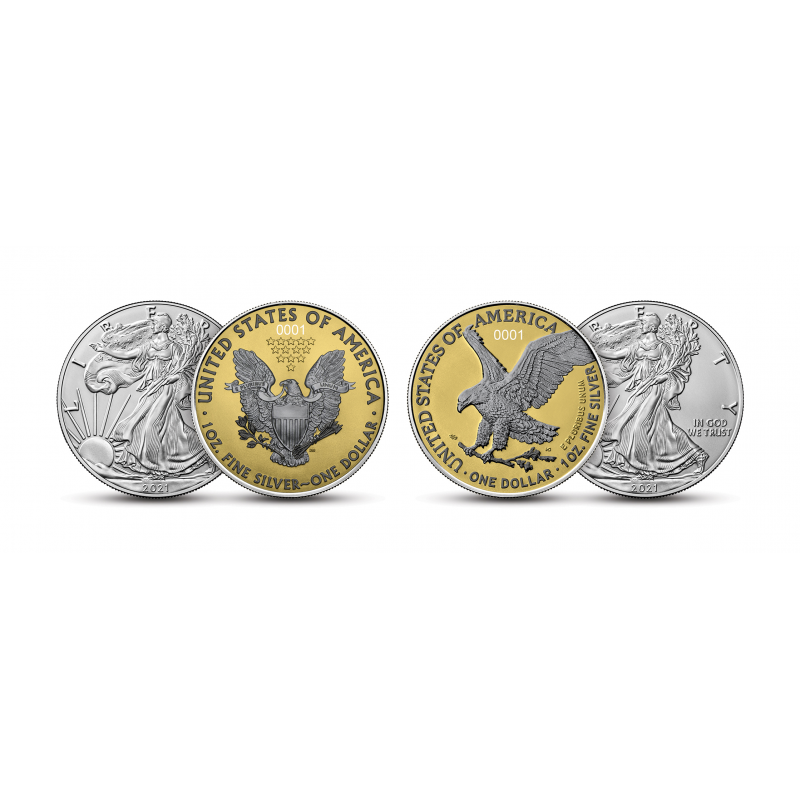 Oferujemy ekskluzywny pakiet obu wersji srebrnej monety American Silver Eagle z 2021, limitowany do 3 000 zestawów. Monety są częściowo uszlachetnione 24-karatowym złotem, rutenem i palladem oraz numerowane i zapakowane w ekskluzywny blister.