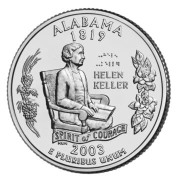 Description: Depicts an image of Helen Keller with her name in English, and in a reduced-size version of braille. An Alabama