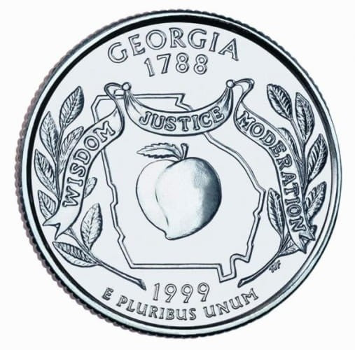 sprigs, and the Georgia state motto, "Wisdom, Justice, Moderation".