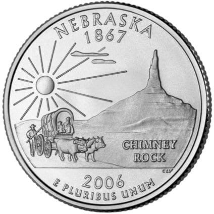 "Chimney Rock," depicts an ox-drawn covered wagon carrying pioneers in the foreground and Chimney