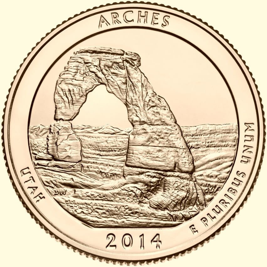 Description: depicts Delicate Arch, a 65-foot freestanding natural arch. The La Sal Mountains are visible in the background. Inscriptions are ARCHES, UTAH, 2014 and E PLURIBUS UNUM.