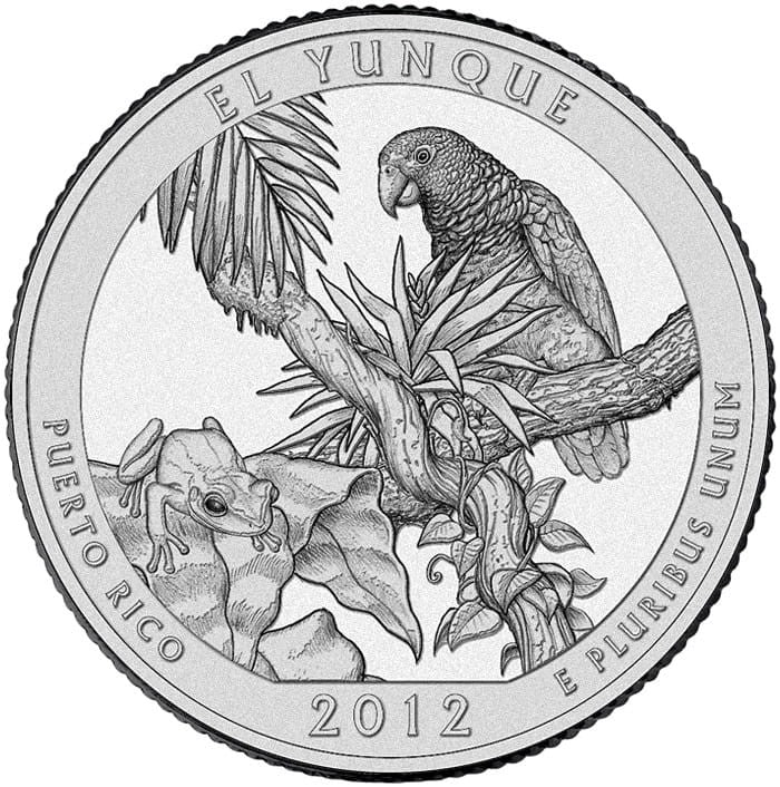 Description: Depicts a Coqui tree frog sitting on a leaf and a Puerto Rican parrot behind an epiphyte plant with tropical flora in the background. Inscriptions are EL YUNQUE, PUERTO RICO, 2012 and E PLURIBUS UNUM.