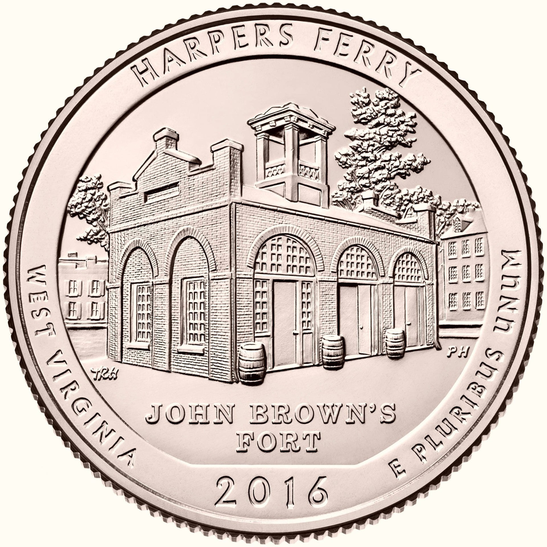 Description: features John Brown’s Fort, the site of John Brown’s last stand during his raid on the Harpers Ferry Armory. Inscriptions are “HARPERS FERRY,” “WEST VIRGINIA,” “JOHN BROWN'S FORT,” “2016” and “E PLURIBUS UNUM.”