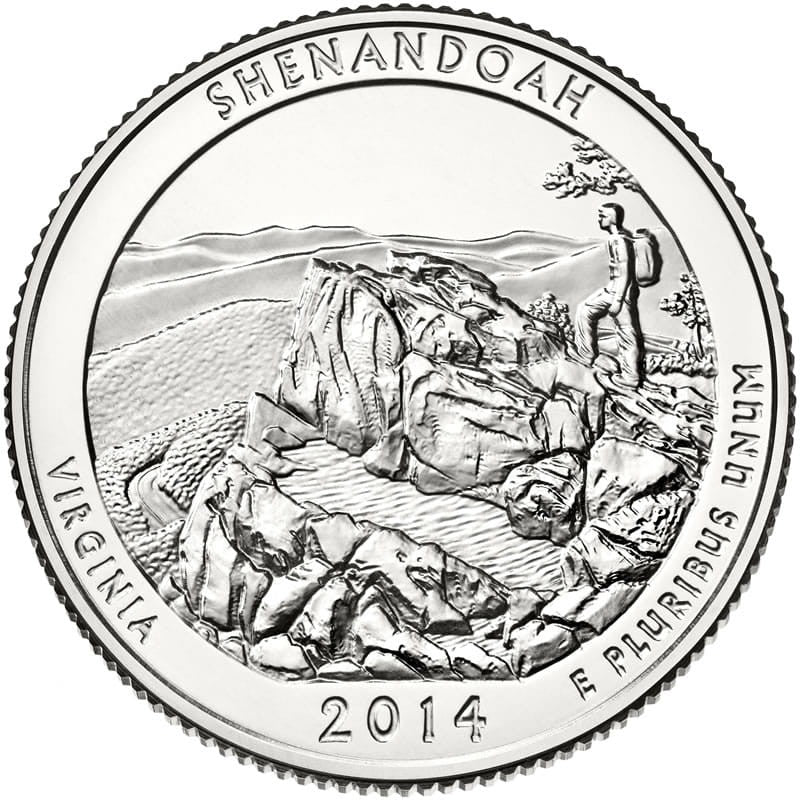 Description: depicts a day hiker taking in the view from Little Stony Man summit. Inscriptions are SHENANDOAH, VIRGINIA, 2014 and E PLURIBUS UNUM.