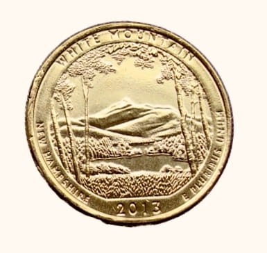 Description: Depicts Mt. Chocorua, the easternmost peak of the Sandwich Range, framed by birch trees. Inscriptions are WHITE MOUNTAIN, NEW HAMPSHIRE, 2013 and E PLURIBUS UNUM.
