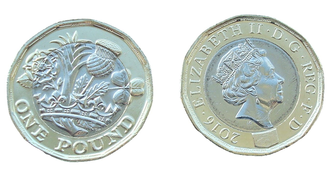 Wielka Brytania 1 funt według nowego wzoru. Data na monecie 2016, wprowadzona do obiegu 28 marca 2017. Na rewersie korona i 4 symbole brytyjskie: róża, por, oset i koniczyna oraz napis ONE POUND. Na awersie portret Elżbiety II oraz napis 2016 ELIZABETH II D G REG F D. Jest to jedna z najlepiej na świecie zabezpieczonych monet. Kształt dwunastokąta, mikrodruk po obu stronach, efekt kątowy oraz ukryta wewnętrzna funkcja bezpieczeństwa.