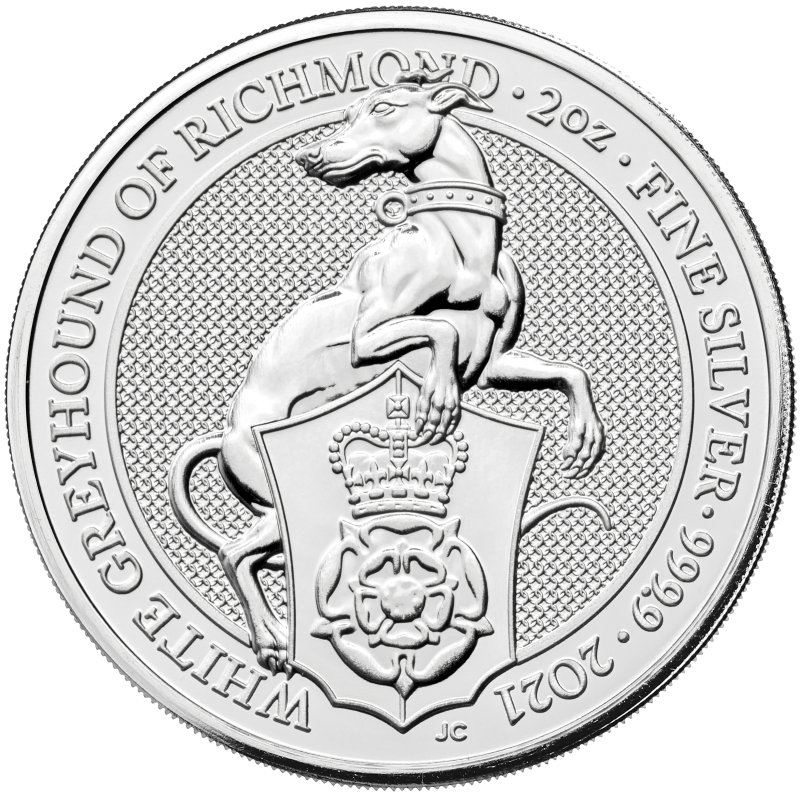 Kolekcja Queen's Beasts swój debiut miała w 2016 roku. Seria prezentuje heraldyczne stworzenia, które stały na straży królowej Elżbiety II podczas jej koronacji w 1953 roku. Biały Chart z Richmond symbolizuje połączenie dwóch dynastii: Yorka i Lancaster. Twórcą herbu był John of Gaunt, syn Edwarda III. Zamieszczona na nim róża symbolizuje więź między dwoma rywalizującymi ze sobą rodami. Biały chart był najpopularniejszą rasą w północnej Anglii. Jest to ostatnie wydanie kończące serię Queen's Beasts składającą się z 10 monet. Awers przedstawia profil królowej Elżbiety II zaprojektowany przed Jody'ego Clarka.
