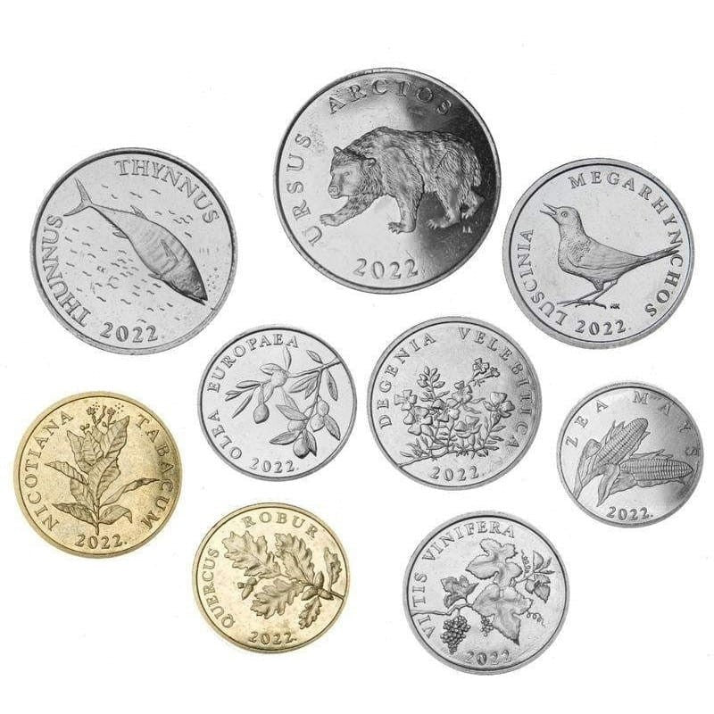 1 kuna - na awersie przedstawiony jest słowik, na rewersie skacząca kuna, z herbem państwa w środku, otoczonym girlandą gałęzi oliwnych i przepiórek.